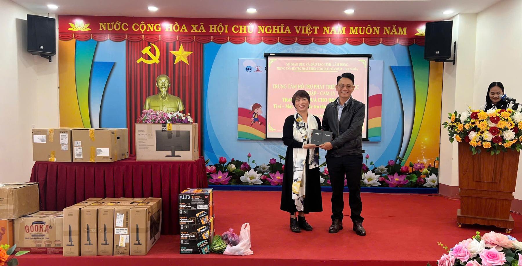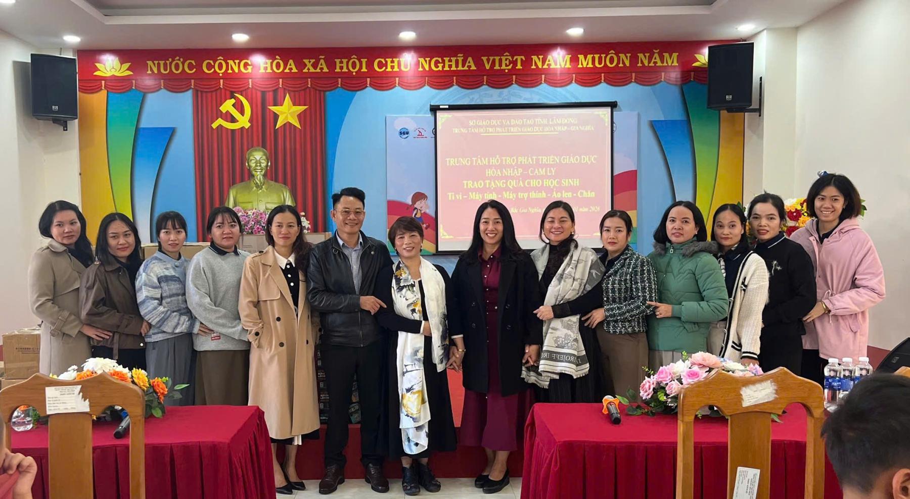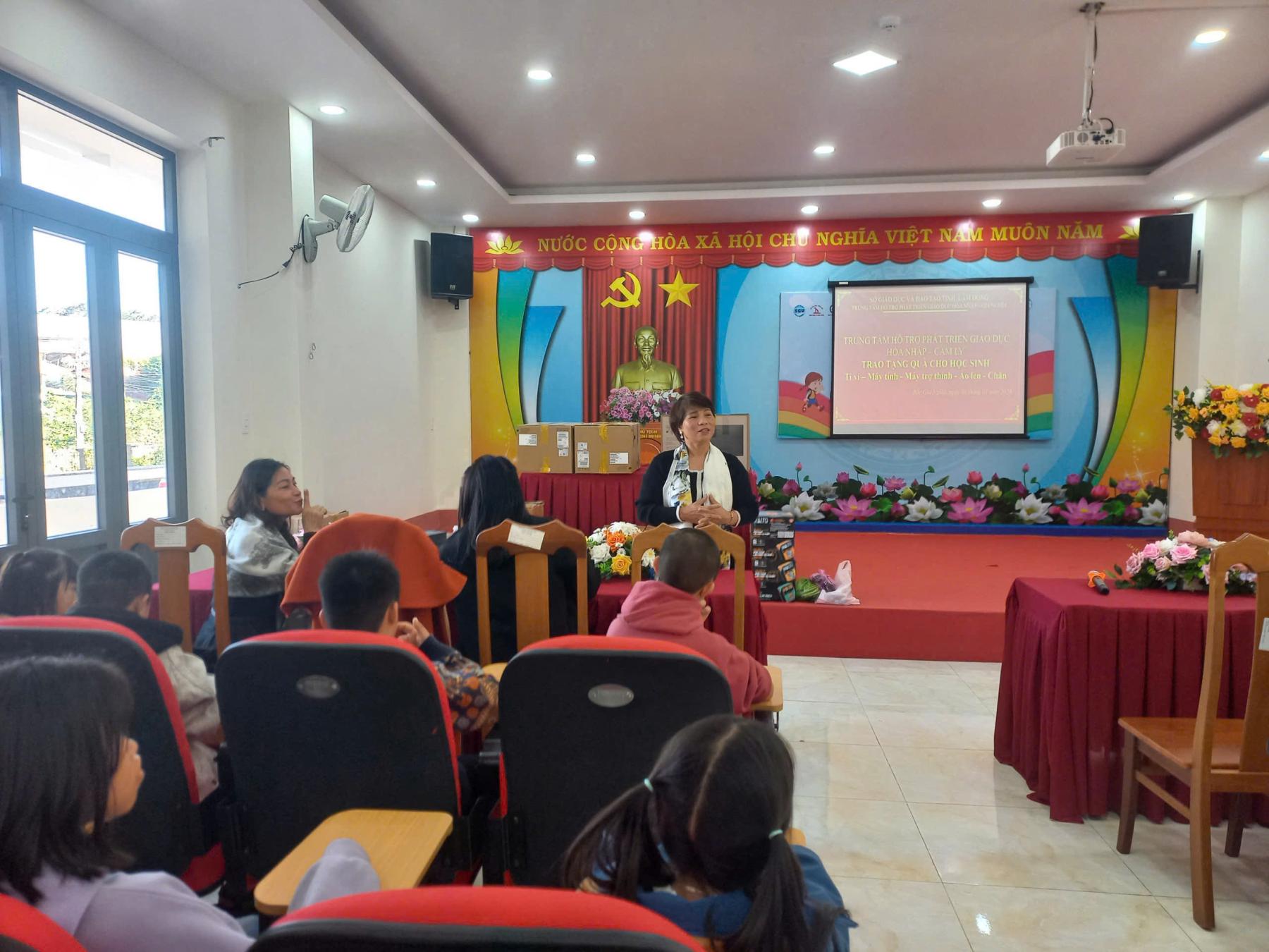 Từ sự thấu hiểu đó, Trung tâm HTPTGDHN – Cam Ly đã trao tặng các phần hỗ trợ thiết thực cho Trung tâm HTPTGDHN – Gia Nghĩa, gồm 12 cặp máy trợ thính, 05 ti vi, 02 bộ máy tính bàn, 50 đôi dép, 200 cuốn vở và 35 chiếc chăn, góp phần cải thiện điều kiện học tập, can thiệp và sinh hoạt cho học sinh khuyết tật.